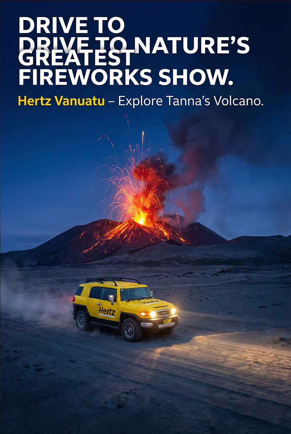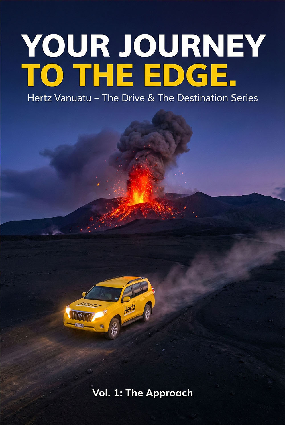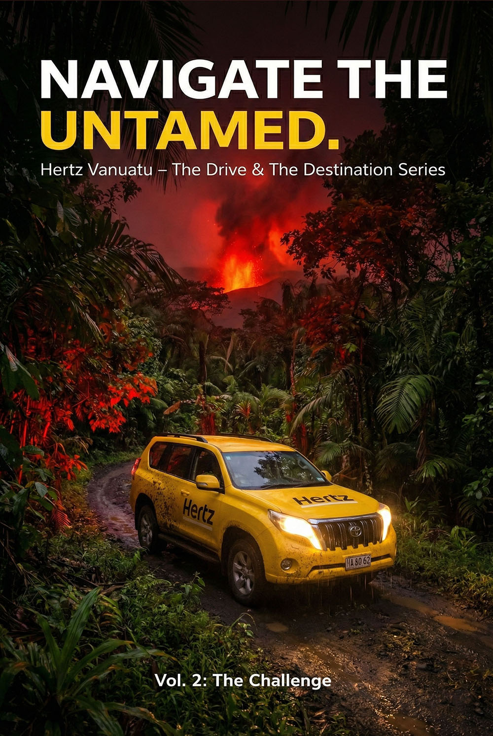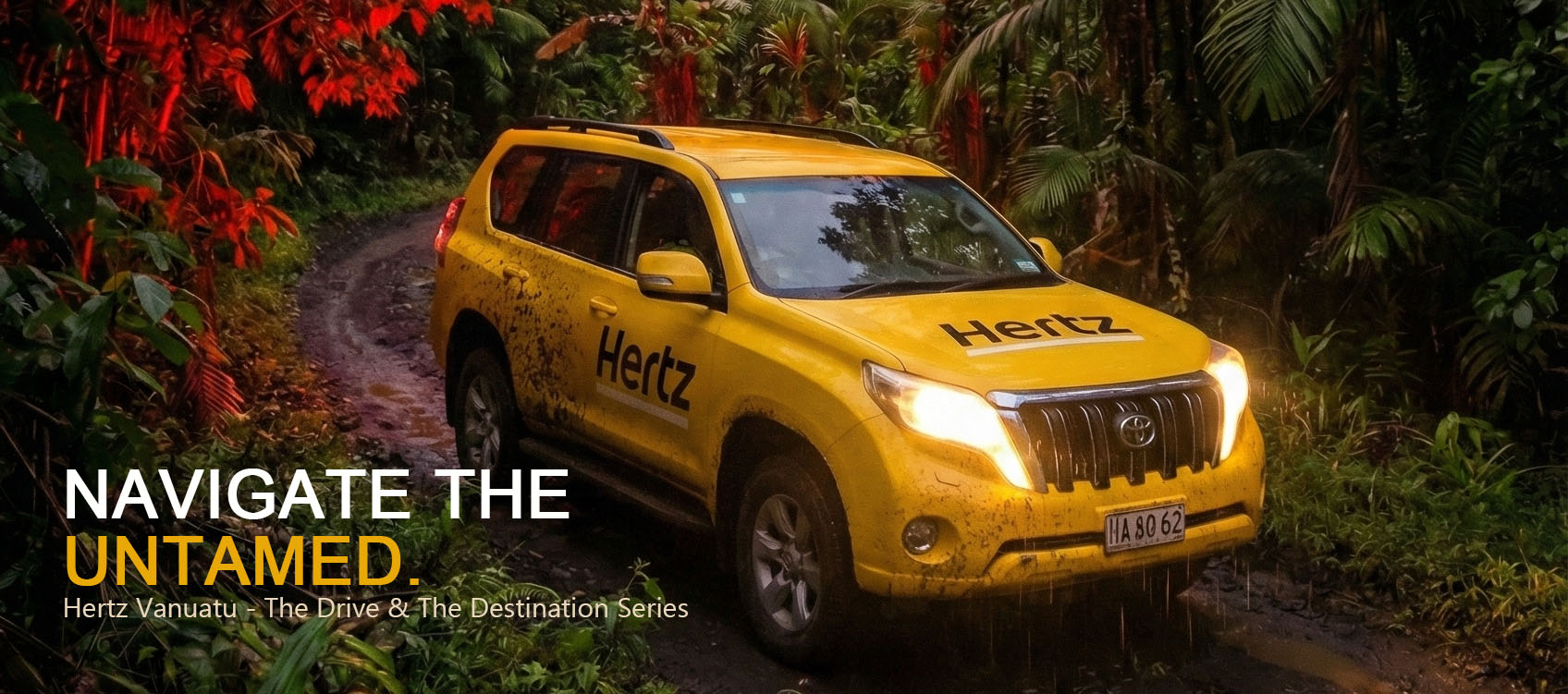 Brand Symbolism Concept: Positioning the car as a "Safe Zone." In the untamed nature of Tanna, Hertz becomes the symbol of civilization and reliability.