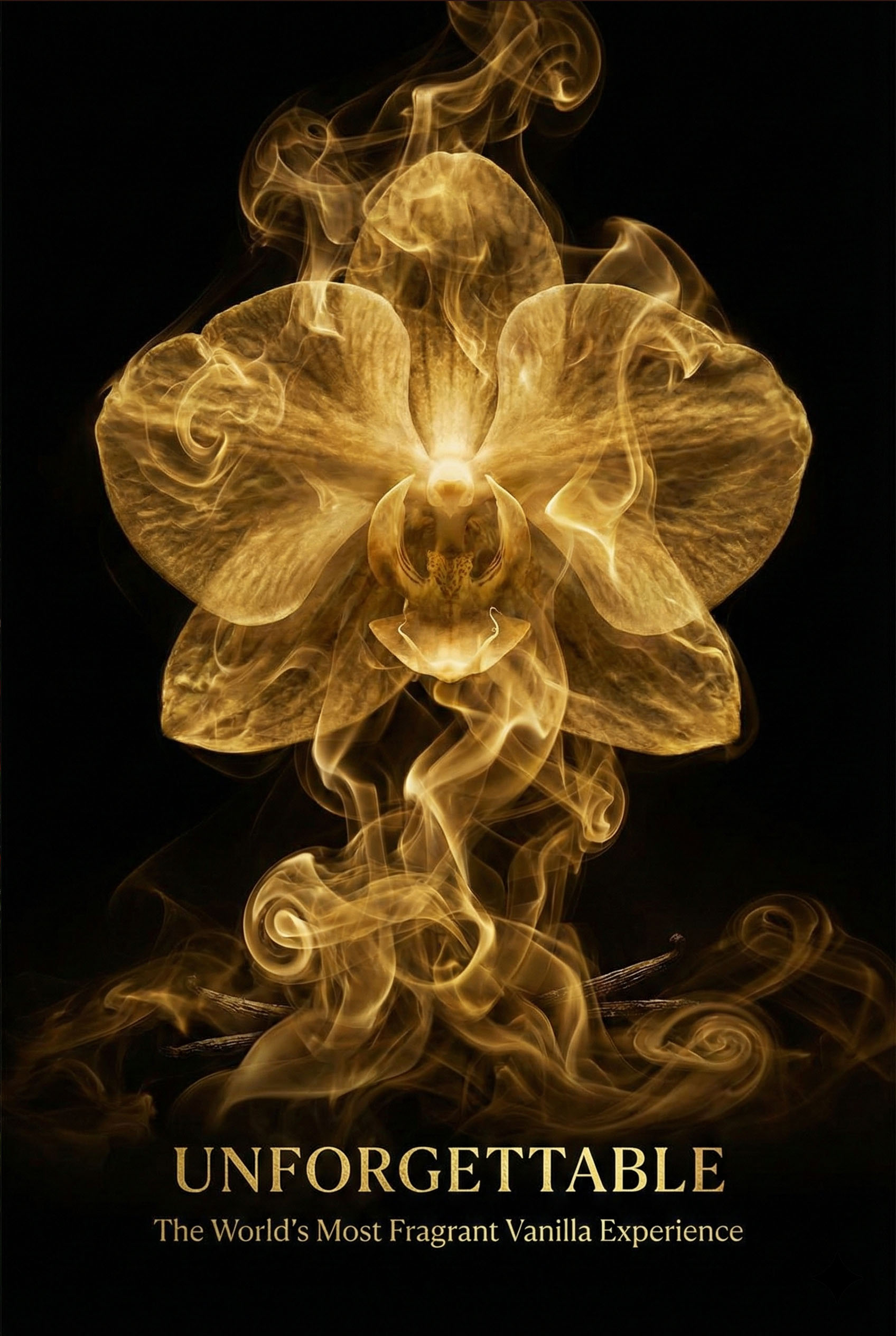 Synesthetic Design Concept: Bridging sight and scent. By contrasting the Creamy White (flowers) with Glossy Black (cured pods), we trigger the olfactory memory through color, making the viewer "smell" the fragrance through the screen.