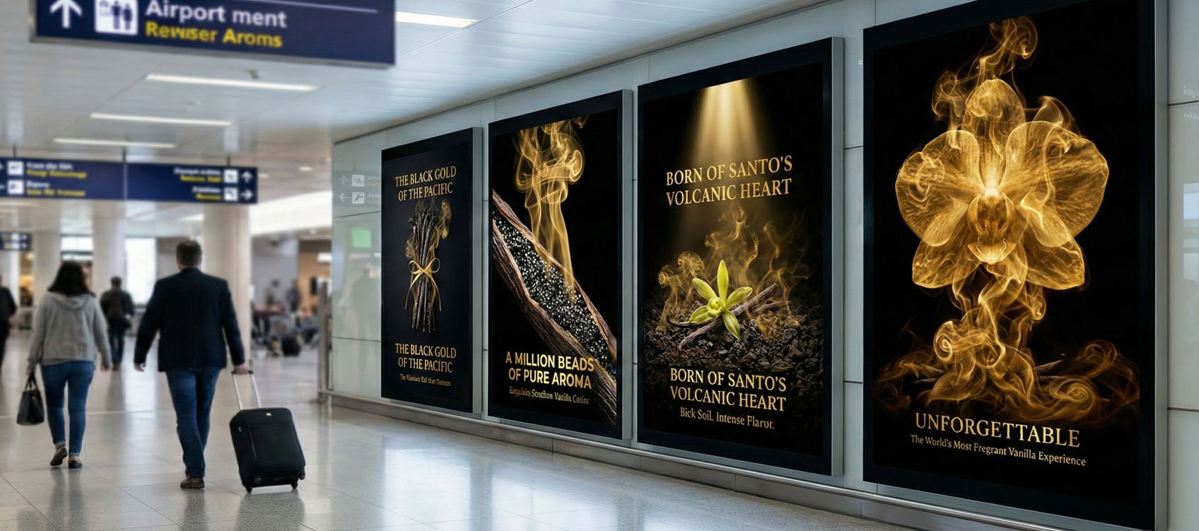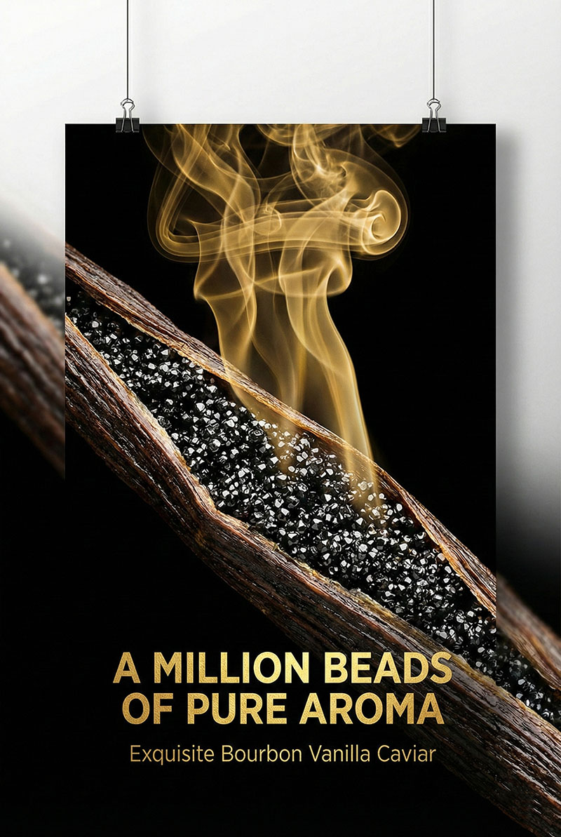 Synesthetic Design Concept: Bridging sight and scent. By contrasting the Creamy White (flowers) with Glossy Black (cured pods), we trigger the olfactory memory through color, making the viewer "smell" the fragrance through the screen.